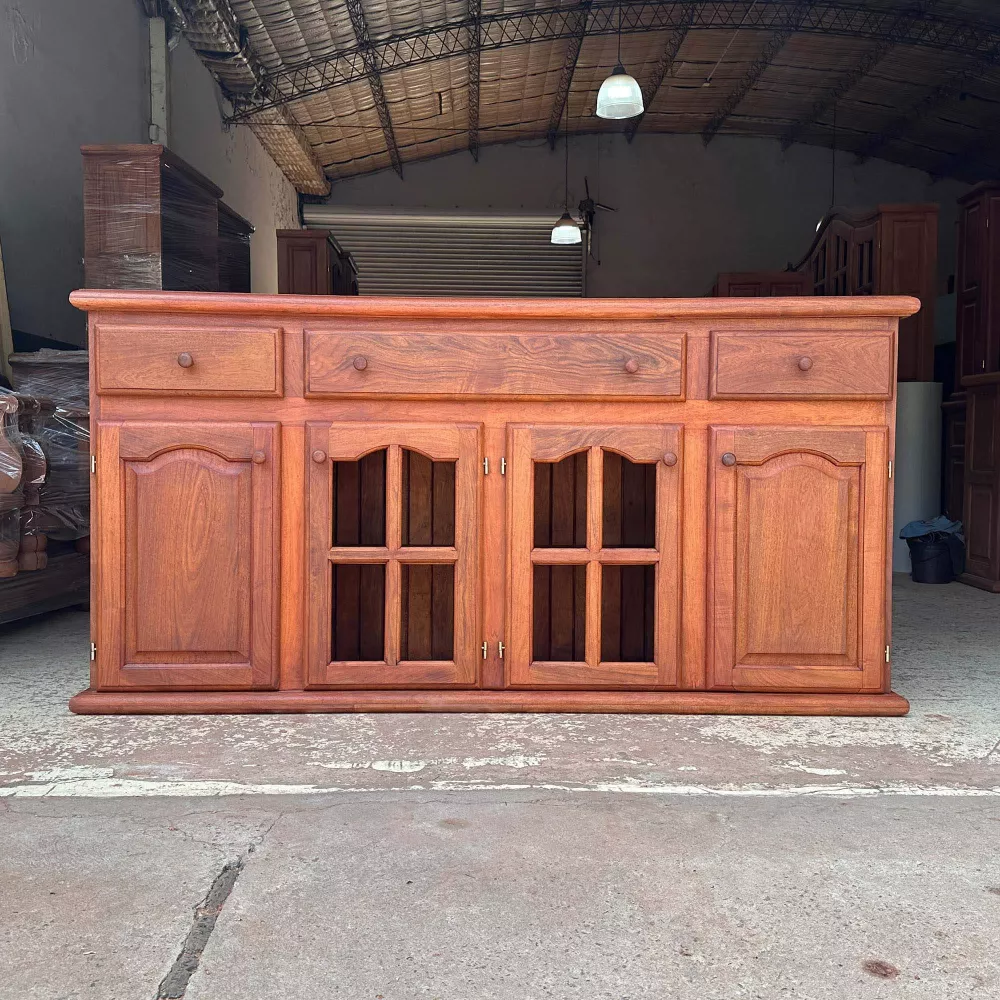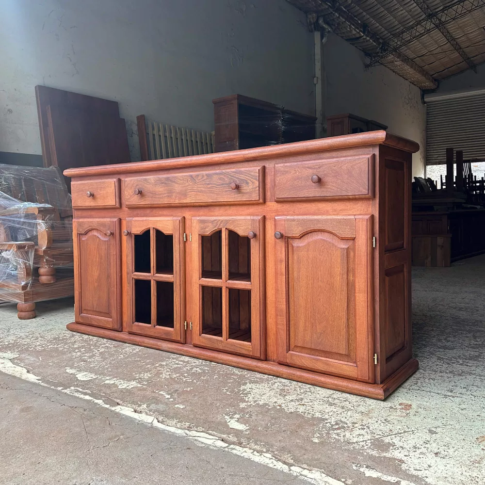 Bahiut aparador de algarrobo de 2 metros, con 3 cajones superiores y 4 puertas inferiores (dos centrales para vidrio). Un mueble amplio, clásico y súper funcional para guardar vajilla, mantelería, copas y todo lo del comedor.