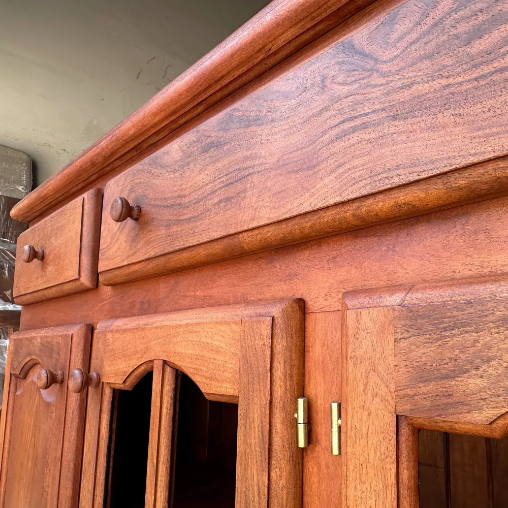 Si querés, este vajillero se puede personalizar: podemos hacerlo con las cuatro puertas con vidrio, cambiar la distribución de cajones (por ejemplo, en lugar de tres cajones hacerlo con cuatro), fabricarlo en otras medidas según tu espacio y también elegir terminación laqueada en vez de encerada.