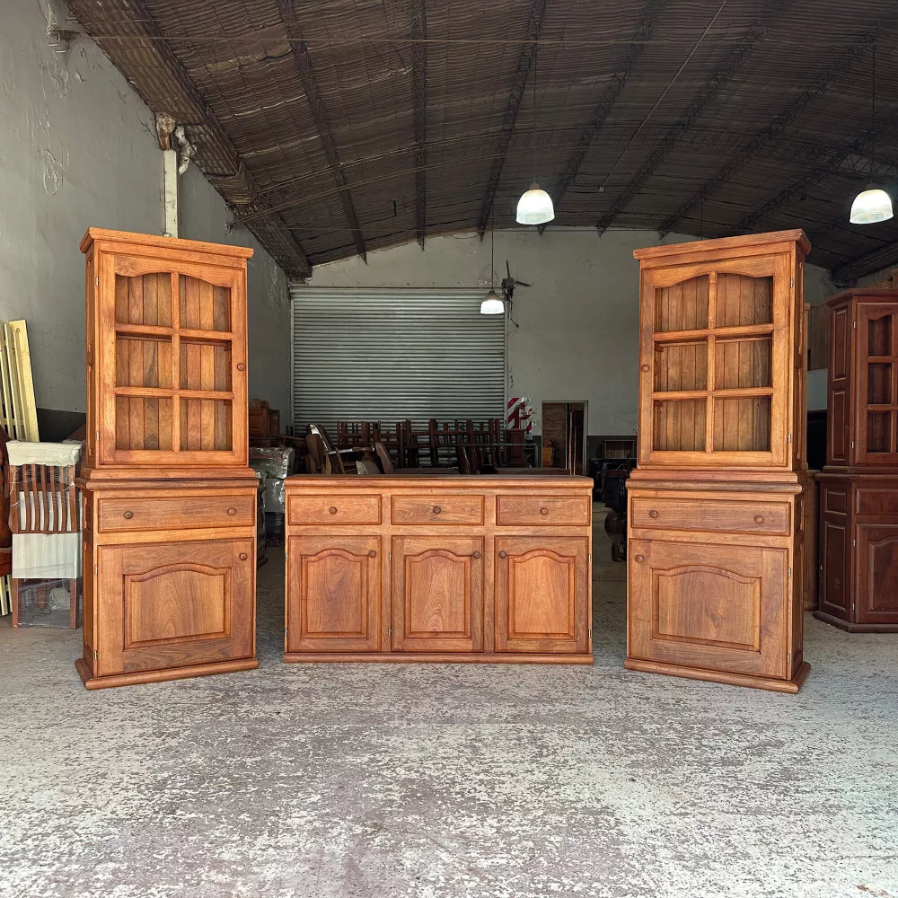 Este rack TV de algarrobo combina espacio central para la tele con vitrinas laterales ideales para exhibir cristalería, vajilla o deco. Abajo suma gran capacidad de guardado con cajones y puertas para mantener el living prolijo y organizado.